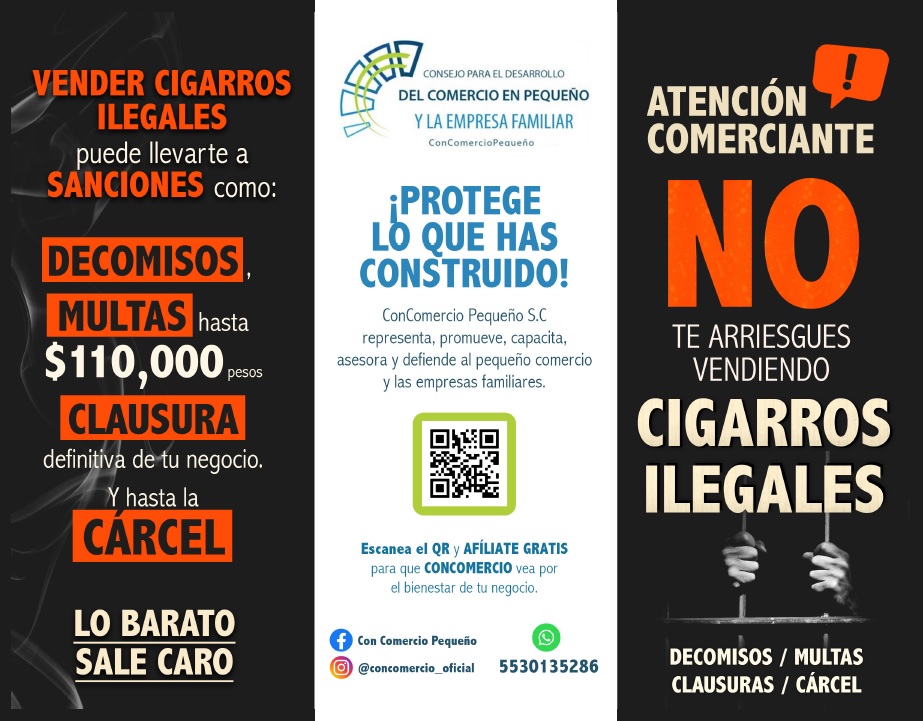“Vender cigarros ilegales puede implicar sanciones que van desde decomiso de la mercancía, multas, clausura definitiva del negocio y hasta cárcel para el propietario o encargado del comercio; por ello, a través de esta campaña, exhortamos a los comerciantes evitar este tipo de prácticas y denunciar ante la autoridad cualquier abuso o extorsión”, advirtió el dirigente empresarial, al externar a los comerciantes ¡Protege lo que has construido!