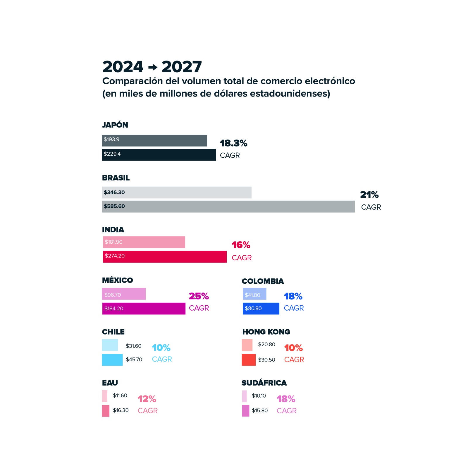 El hallazgo más relevante para México; con una tasa compuesta de crecimiento anual (CAGR) del 34% en comercio electrónico transfronterizo, México lidera todos los mercados analizados en el informe, superando a Japón (33.5%), Brasil (28%), India (18%) y Chile (15%), entre otros. Para 2027, el volumen transfronterizo de México casi se duplicará, pasando de 20,400 millones a 47,400 millones de dólares, lo que lo convierte en uno de los ecosistemas digitales de más rápido crecimiento a nivel global.